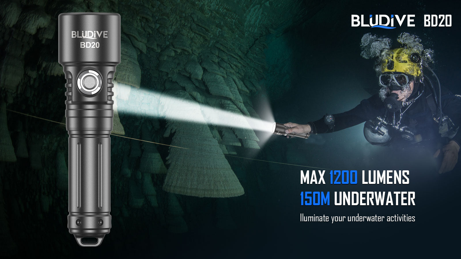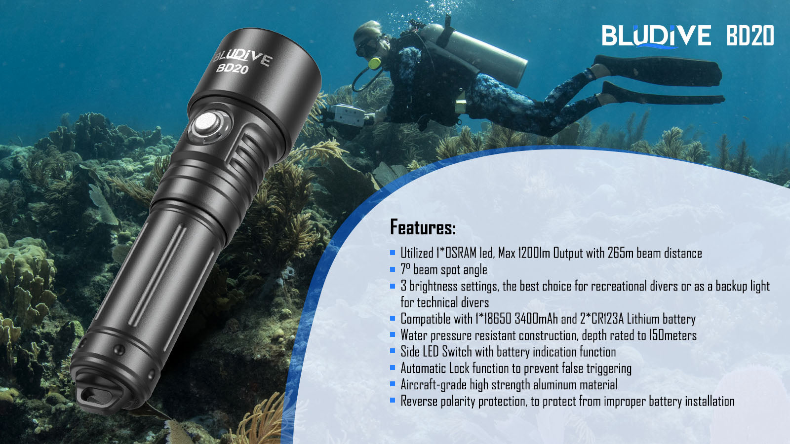 BLUDIVE BD20 18650 1200lm Side button Receational Dive Flashlight