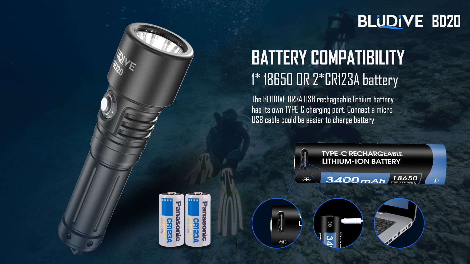 Inside the Box | 1*BD20 dive flashlight, 1*Diving Lanyard, 3*Orings, 1 *manual, 1*18650 3400mAh Lithium battery |